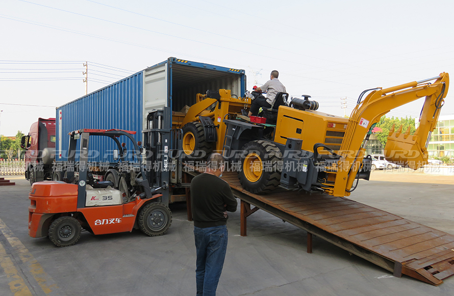 9月17日 福瑞得機械1臺挖掘裝載機,1手扶壓路機和1臺平板夯打包、裝箱出口澳大利亞。