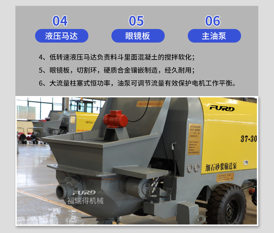 產(chǎn)品介紹: 1,大流量 采用加粗料缸,讓機(jī)械每一次循環(huán)出料多20% 2,效率高 移動(dòng)便捷全部采用快接式管道卡,提高工作效率 3,便捷 本機(jī)可遠(yuǎn)程遙控,操作不受地點(diǎn)限制,更加人性化 產(chǎn)品用途: 坡道灌漿,水平地面,隧道澆筑,模